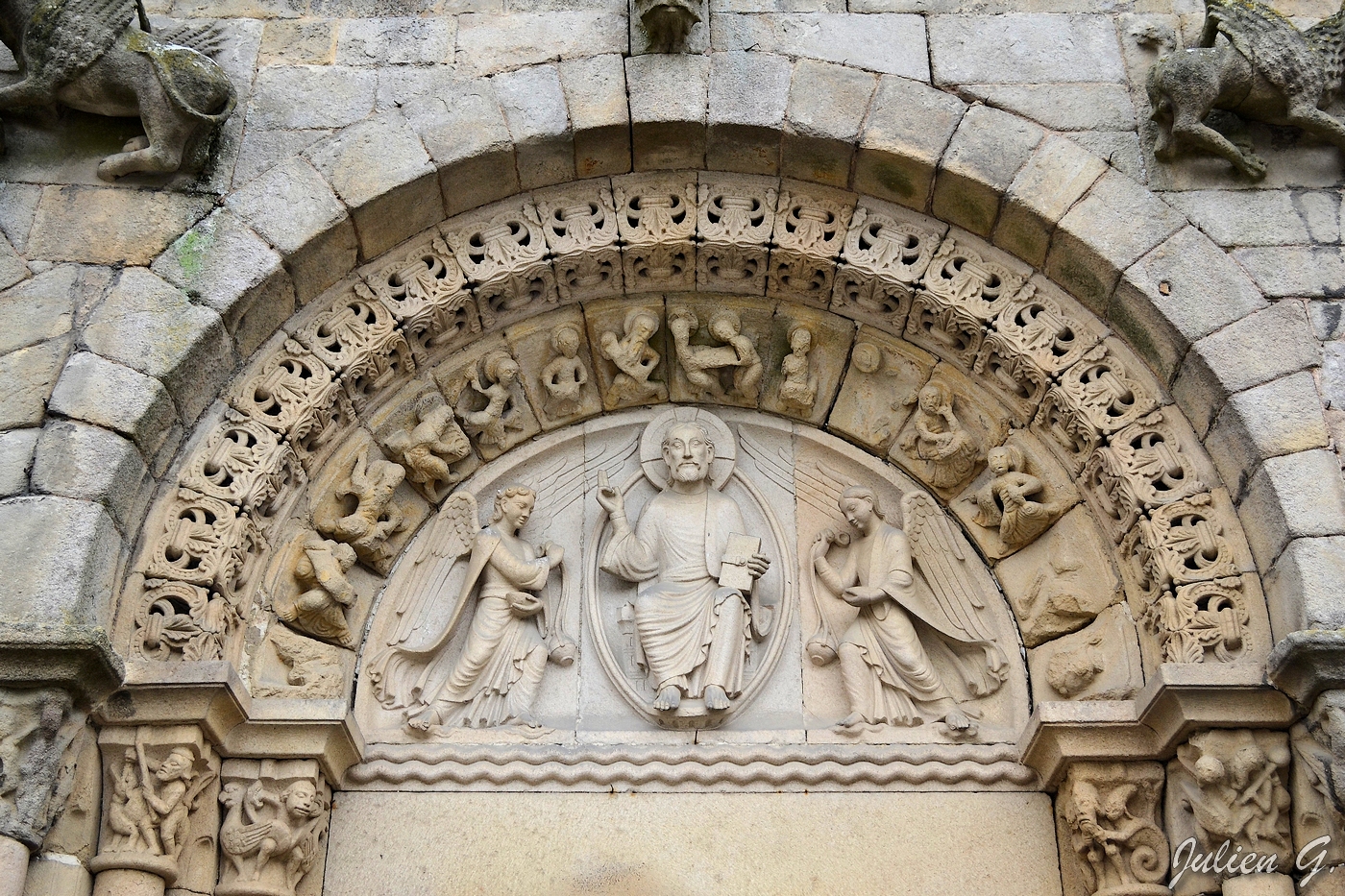 La façade occidentale comprend trois porches séparés par des groupes de 5 colonnettes. Les deux portails latéraux sont aveugles, seul le central comprend une entrée. Un bœuf et un lion, tous les deux ailés et symbolisant saint Luc et saint Marc, surplombent les arcades du portail. L'étage inférieur de la façade est d'époque romane. Une large baie est ajoutée au-dessus de la façade initiale.