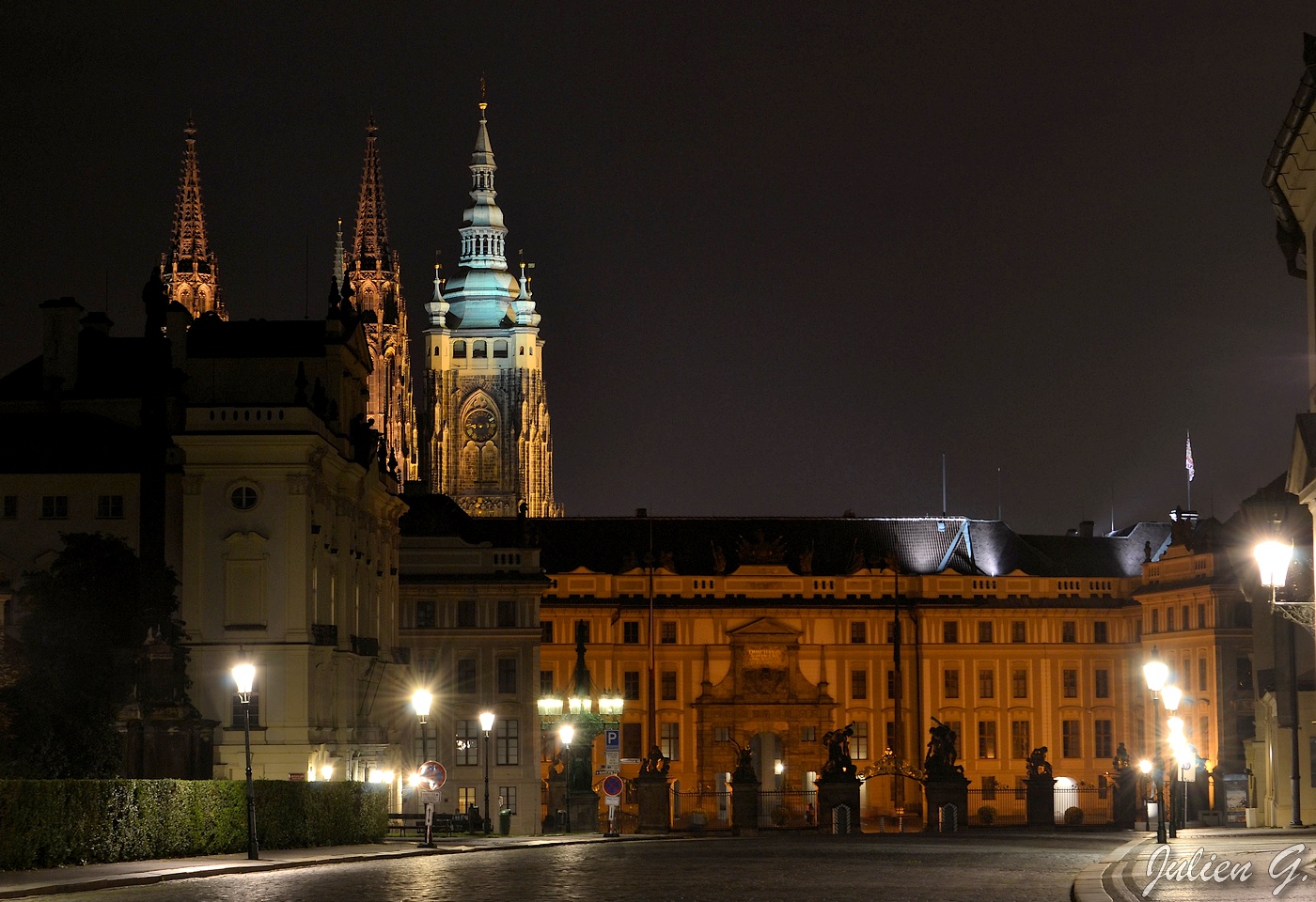 On accède au château par la grande grille sur la place Hradčanské náměstí (place du Château) qui permet d’entrer dans la première cour, de style XVIIIe siècle. Un porche permet d’accéder à la deuxième cour, de style baroque, avec sa fontaine centrale (achat des tickets dans cette cour). Après un autre porche, on arrive dans la plus grande cour du château. Cette troisième cour contient en effet tout le volume de la cathédrale Saint-Guy (cliquez ici pour la découvrir de jour). L’ancien Palais Royal se découvre dans cette troisième cour, face à la cathédrale. Les parties les plus anciennes datent du XIIe siècle. Le palais a été occupé par les rois de Bohême du XIIIe au  XVIe siècles. La basilique Saint-Georges se situe à l’arrière de la cathédrale, face à son chevet. La façade baroque ajoutée au XVIIIe siècle contraste avec son intérieur Roman datant du Xe siècle.